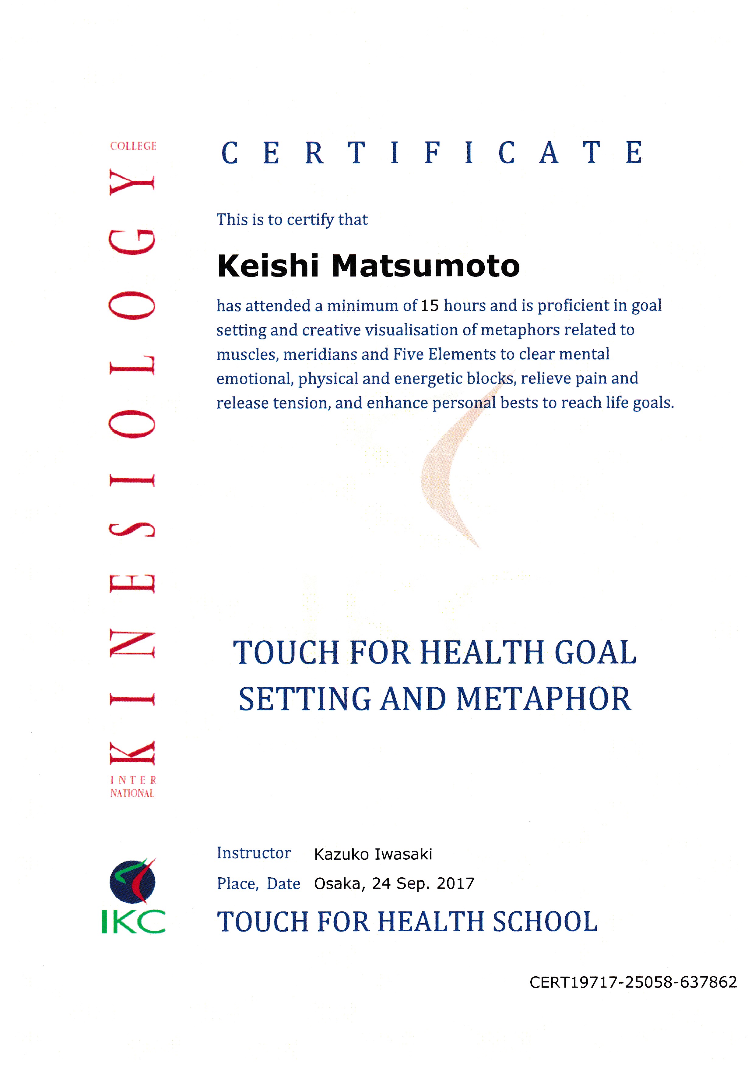 機能訓練指導員認定柔道整復師認定証 タッチフォーヘルスレベル1〜4・メタファー認定証