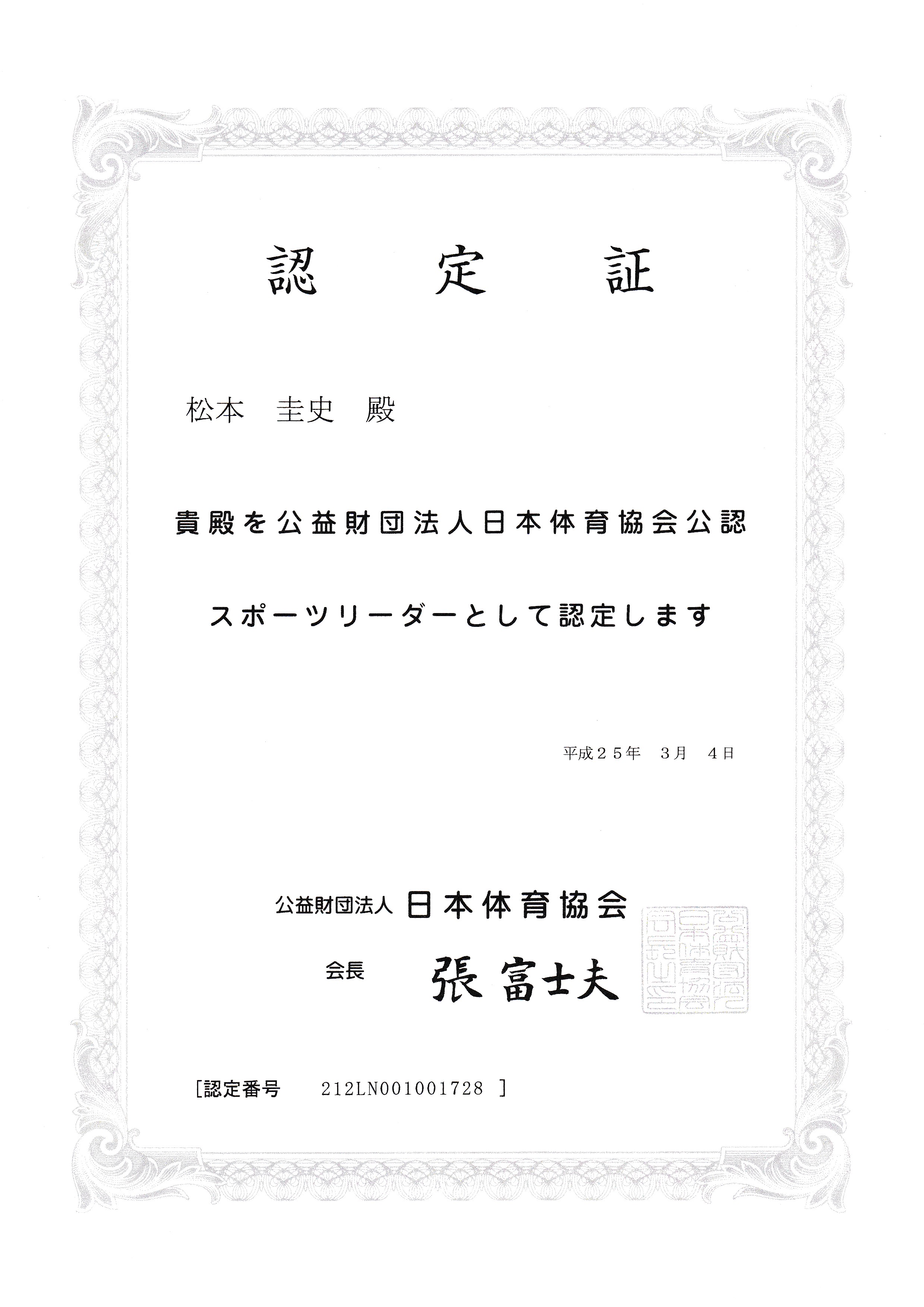 レッシュ・プレイヤー級トレーナー認定証 日本体育協会公認スポーツリーダー認定証
